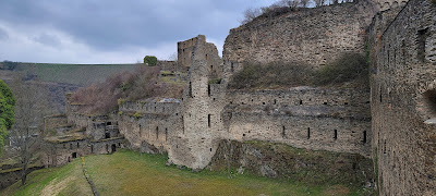 if you look closely, you can see some super scary super steep steps you can take down towards the entrance. We did not do that. I looked at it from up top and went nah. So we took the looong way around (which we didn't mind, because the place was awesome) and walked back towards the entrance negotiating the much gentler slope Burg Rheinfels was built around. |
